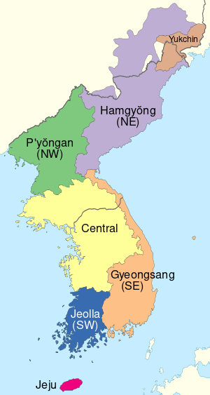 Korean dialects form a dialect continuum stretching from the southern end of the Korean peninsula to Yanbian prefecture in the Chinese province of Jilin, though dialects at opposite ends of the continuum are not mutually intelligible.[7] This area is usually divided into five or six dialect zones following provincial boundaries, with Yanbian dialects included in the northeastern Hamgyŏng group.[8][9] Dialects differ in palatalization and the reflexes of Middle Korean accent, vowels, voiced fricatives, word-medial [] and word-initial [] and [].[10][11]