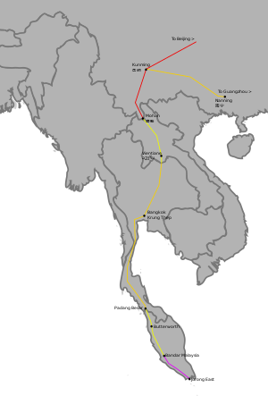 The proposed network consists of three main routes from Kunming, China to Bangkok, Thailand: the Eastern route via Vietnam and Cambodia; the central route via Laos, and the western route via Myanmar. The southern half of the network from Bangkok to Singapore has long been operational, though a high-speed line has been proposed.[5]