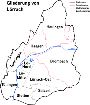 Lörrach is subdivided into three boroughs and three districts. In sum, the three boroughs have an area of 18.6 km².