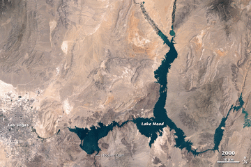 ![]() Satellite imagery from Landsat 8 of Lake Mead in July 2022 during the 2020–23 North American drought | |