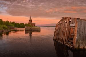 Many other historical monuments are scattered around the lake. They include the Dormition Monastery (ru) on the cape Muromsky, on the eastern shore of the lake. The monastery was founded in 1350, closed in 1918 and revived in 1991.[32]