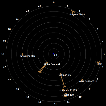 At 8.304 سنة ضوئية (2.546 فرسخ فلكي)[1] away it is one of the stars nearest to the Solar System; only the Alpha Centauri system, Barnard's Star, Wolf 359, and the brown dwarfs Luhman 16 and WISE 0855−0714 are known to be closer.[12] Because of its proximity it is a frequent subject for astronomical surveys and other research and thus is known by numerous other designations, most commonly Gliese 411 and HD 95735. In approximately 19,900 years it will be at its closest, about 4.65 ly (1.43 pc) from the Sun, just over half its present distance.[13][14]