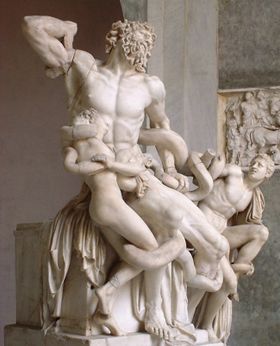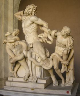 The statue of Laocoön and His Sons, also called the Laocoön Group (إيطالية: Gruppo del Laocoonte), has been one of the most famous ancient sculptures since it was excavated in Rome in 1506 and put on public display in the Vatican Museums,[5] where it remains today. The statue is very likely the same one that was praised in the highest terms by Pliny the Elder, the main Roman writer on art, who attributed it to Greek sculptors but did not say when it was created.[6] The figures in the statue are nearly life-sized, with the entire group measuring just over 2 m (6 ft 7 in) in height. The sculpture depicts the Trojan priest Laocoön and his sons Antiphantes and Thymbraeus being attacked by sea serpents.[1]