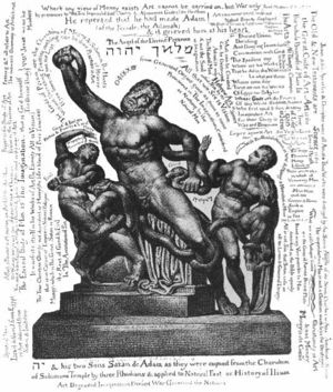 The most unusual intervention in the debate, William Blake's annotated print Laocoön, surrounds the image with graffiti-like commentary in several languages, written in multiple directions. Blake presents the sculpture as a mediocre copy of a lost Israelite original, describing it as "Jehovah & his two Sons Satan & Adam as they were copied from the Cherubim Of Solomons Temple by three Rhodians & applied to Natural Fact or History of Ilium".[63] This reflects Blake's theory that the imitation of ancient Greek and Roman art was destructive to the creative imagination, and that Classical sculpture represented a banal naturalism in contrast to Judeo-Christian spiritual art.