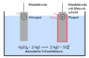 في حالة الشحن الكامل، تتكون الصفيحة السالبة من الرصاص، واللوحة الموجبة هي أكسيد الرصاص الرباعي. يحتوي محلول الكهرل على تركيز أعلى من حمض الكبريتيك المائي، والذي يخزن معظم الطاقة الكيميائية.