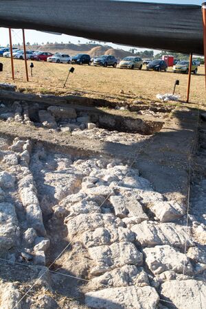 Until the 20th century, the exact location of the castra (“camp” in the sense of a permanent military base) of the Sixth Legion had not been confirmed, but textual evidence placed it in the Jezreel Valley along the road from Caesarea Maritima to Beth Shean, in the vicinity of Meggido. Surveys conducted by Israeli archaeologist Yotam Tepper identified Roman remains in the region, including coins and roof tiles stamped with the name of the Sixth Legion. In 2010 and 2011, Tepper teamed up with the Jezreel Valley Regional Project and the Center for Research and Archaeology of the Southern Levant. Together, Jessie A. Pincus and Timothy DeSmet conducted a ground-penetrating radar and Electromagnetic survey of this area and published their results with the accompanying archaeogeophysical interpretation.[18] With the results of those two surveys the collective team decided upon the best areas for excavation during the 2013 field season. Thus in 2013, the team excavated the Legio VI Ferrata camp, uncovering defensive earthworks, a circumvallation rampart, barracks areas and artifacts including roof tiles stamped with the name of the Sixth Legion, coins and fragments of scale armor.[16]