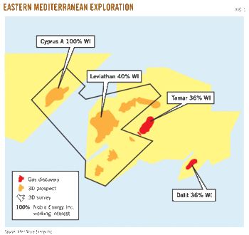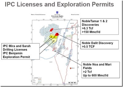 امتيازات التنقيب الممنوحة من شركة نفط إسرائيل IPC المعلنة حتى 2010، والاكتشافات المؤخرة في تلك الامتيازات. لاحظ أن منطقة امتياز لڤياثان في اقصى الغرب غير موجودة ضمن الامتيازات. وحتى وقت صدور تلك الخريطة في مطلع 2010، كانت تلك المنطقة ضمن امتياز التنقيب المصري المسمى شمال شرق المتوسط "نيميد".