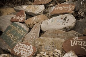 Stone tablets with prayers in Tibetan at a Temple in McLeod Ganj