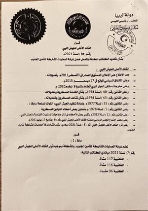 في 20 يونيو 2021، انشقت الكتيبة 116 سبها بقيادة مسعود جدو 116 في سبها عن الجيش الوطني الليبي بقيادة خليفة حفتر. بعدها قام المجلس الرئاسي الليبي بتعيين جدو رئيساً لقوة جديدة في سبها.