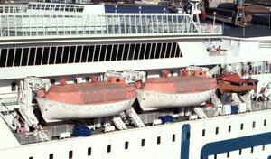 Merchant Vessels whose keels were laid on or before 1 January 1986 are required to have 200% evacuation capacity with one lifeboat fitted on the port side and one on the starboard side, so that a lifeboat is always available even if the ship is listing to one side. Lifeboat capacity is specified[5] and listed on the ship's "safety equipment certificate". Further details of the boats are found in "Form E" of this certificate.[بحاجة لمصدر]