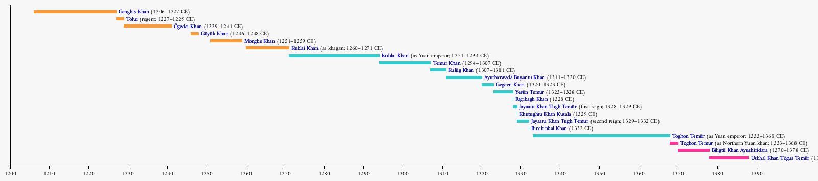 Notes: 1) Decades before Kublai Khan announced the dynastic name "Great Yuan" in 1271, Khagans (Great Khans) of the "Great Mongol State" (Yeke Mongγol Ulus) already started to use the Chinese title of Emperor (الصينية: 皇帝; پنين: Huángdì) practically in the Chinese language since the enthronement of Genghis Emperor (成吉思皇帝; 'Chéngjísī Huángdì') in Spring 1206.[1] However, until Kublai Khan ruled China in 1260, these titles were just translations of the Mongolian word Khagan (الصينية: 合罕; پنين: Héhàn, Great Khan). North China was only part of the territory occupied by the Mongol Empire.[2] 2) To non-Chinese readers, usually the khan names are the most familiar names. 3) Timur or Temür means the same Mongolian words but Temür will be used for avoiding confusion with Timur. 4) The clan name (surname) of all emperors is Borjigin (孛兒只斤 Bó'érjìjǐn). According to Mongolian tradition, clan names are not used together with given names, and Mongolian people are usually referred by their given names only. Therefore, only given names are shown in the following list. | ||||||||