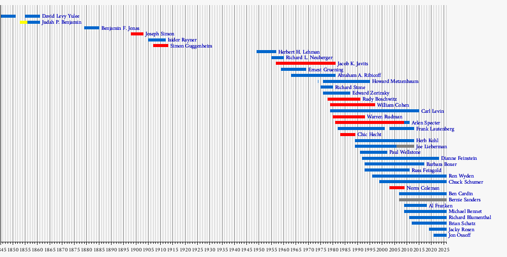 | David Levy Yulee[أ] | Democratic | Florida | July 1, 1845 | March 4, 1851 | 2٬072 (5 years, 246 days) |