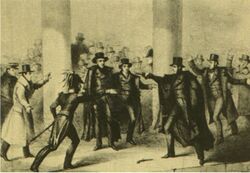 January 30, 1835: Just outside the Capitol Building, a house painter named Richard Lawrence attempted to shoot President Andrew Jackson with two pistols, both of which misfired. Lawrence was apprehended after Jackson beat him severely with his cane. Lawrence was found not guilty by reason of insanity and confined to a mental institution until his death in 1861.[44]