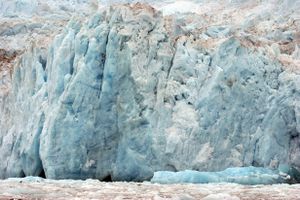 Furtwängler Glacier (في الواجهة) as it appeared in August 2014. Behind the glacier are snowfields and the Northern Icefield.