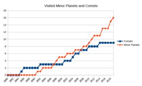 A total of 19 minor planets (asteroids, dwarf planets, and Kuiper belt objects) have been visited by space probes. Moons (not directly orbiting the Sun) and planets are not minor planets and thus are not included in the table below.