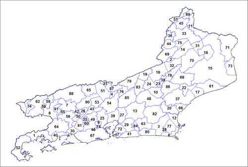 بلديات ريو دي جانيرو، البرازيل. انظر الجدول للمفتاح.[n 1]