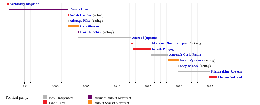 عمل سبعة أشخاص كرئيس في موريشيوس منذ تأسيس المكتب في عام 1992 ، عندما أصبحت موريشيوس جمهورية ضمن كومنولث الأمم. توقفت الملكة إليزابيث الثانية عن رئاسة الدولة ملكة موريشيوس، وتم تعيين الحاكم العام، السير ڤيراسامي رينگادو، أول رئيس لموريشيوس. يتم انتخاب الرئيس من قبل الجمعية الوطنية لمدة خمس سنوات. في حالة وجود شاغر، يعمل نائب الرئيس منصب الرئيس بالنيابة.Mauritius became a republic under the Constitution of 1992 and the monarch and governor-general were replaced by a ceremonial president.