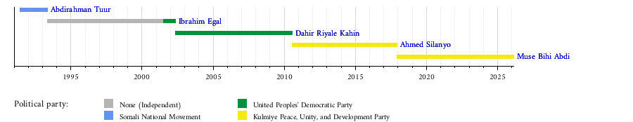 2017 | 13 December 2017 | Incumbent | 8 years, 61 days | Peace, Unity, and Development Party (KULMIYE) | |