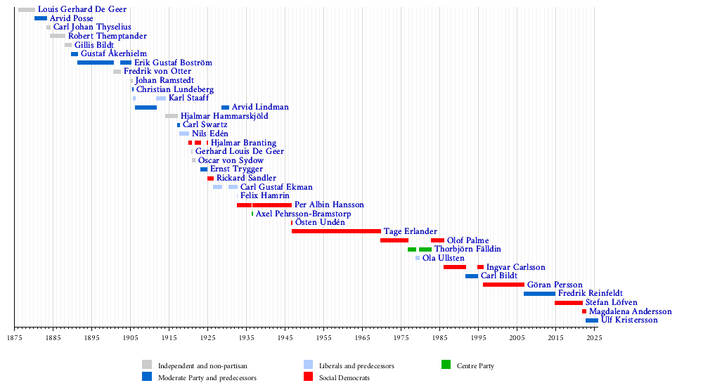 Prior to the creation of the office of prime minister in 1876, Sweden did not have a head of government distinct from its head of state, the monarch, who traditionally held all executive authority. Louis De Geer, the architect of the bicameral Riksdag of 1866, which replaced the centuries-old Riksdag of the Estates, became Sweden's first prime minister in 1876. اعتبارا من 2022[تحديث], the prime minister of Sweden is Ulf Kristersson, leader of the Moderate Party. The list below contains statistics about the tenures of each of the prime ministers of Sweden since 1876.