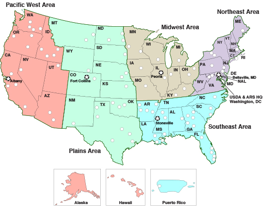The Agricultural Research Service (ARS) is the research arm of the USDA. The ARS has sectioned their work into five geographic regions:
