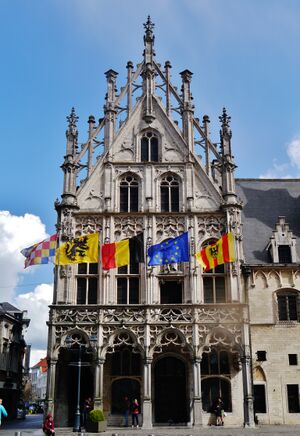 A city hall in Mechelen, Belgium uses these flags, including the city flag. (from left to right) Antwerp Province, Flanders, Belgium, European flag and Mechelen.