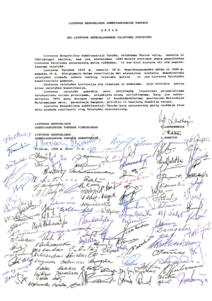 في 18 مايو 1989، أعلنت جمهورية لتوانيا الاشتراكية السوڤيتية نفسها دولة ذات سيادة، مع أنها لا تزال جزءاً من الاتحاد السوڤيتي. في 11 مارس 1990، أُعيد تأسيس جمهورية لتوانيا كدولة مستقلة، وكانت أول جمهورية سوڤيتية تنسحب من موسكو، مما دفع دولاً أخرى إلى القيام بذلك. اعتبرت لتوانيا الاحتلال والضم السوڤيتي غير قانونياً، ومثل دولتي البلطيق الأخريين، ادعت استمرارية الدولة. وقد اعترفت معظم القوى الغربية بهذه الاستمرارية القانونية. اعتبرت السلطات السوڤيتية إعلان الاستقلال غير قانوني، ولكن بعد أحداث يناير في لتوانيا ومحاولة الانقلاب السوڤيتية الفاشلة في موسكو عام 1991، اعترف الاتحاد السوڤيتي نفسه باستقلال لتوانيا في 6 سبتمبر 1991.