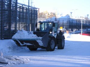 Front-loaders are commonly used to remove snow especially from sidewalks, parking lots, and other areas too small for using snowplows and other heavy equipment. They are sometimes used as snowplows with a snowplow attachment but commonly have a bucket or snow basket, which can also be used to load snow into the rear compartment of a snowplow or dump truck.