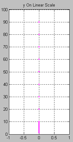 Note that the values of y are easily picked off the above figure. By comparison, values of y less than 10 are difficult to determine from the figure below, where they are plotted on a linear scale, thus confirming the earlier assertion that values spanning large ranges are more easily read from a logarithmically scaled graph.