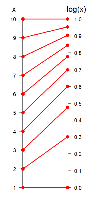 When values that span large ranges need to be plotted, a logarithmic scale can provide a means of viewing the data that allows the values to be determined from the graph. The logarithmic scale is marked off in distances proportional to the logarithms of the values being represented. For example, in the figure below, for both plots, y has the values of: 1, 2, 3, 4, 5, 6, 7, 8, 9 10, 20, 30, 40, 50, 60, 70, 80, 90 and 100. For the plot on the left, the log10 of the values of y are plotted on a linear scale. Thus the first value is log10(1) = 0; the second value is log10(2) = 0.301; the 3rd value is log10(3) = 0.4771; the 4th value is log10(4) = 0.602, and so on. The plot on the right uses logarithmic (or log, as it is also referred to) scaling on the vertical axis. Note that values where the exponent term is close to an integral fraction of 10 (0.1, 0.2, 0.3, etc.) are shown as 10 raised to the power that yields the original value of y. These are shown for y = 2, 4, 8, 10, 20, 40, 80 and 100.