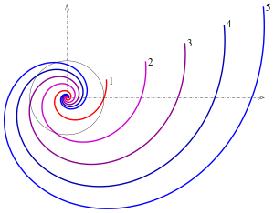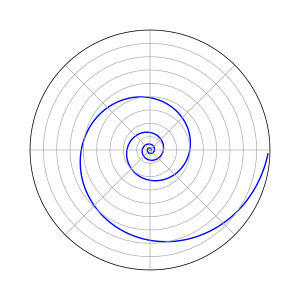 - Rotating, scaling: Rotating the spiral by angle yields the spiral , which is the original spiral uniformly scaled (at the origin) by . Scaling by gives the same curve.