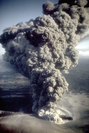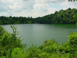 البحيرة البركانية إنگليزية: Maar هي broad, low-relief volcanic crater caused by a phreatomagmatic eruption (an explosion which occurs when groundwater comes into contact with hot lava or magma). A maar characteristically fills with water to form a relatively shallow crater lake which may also be called a maar.[1] The name comes from a Moselle Franconian dialect word used for the circular lakes of the Daun area of Germany.[2] Maars are shallow, flat-floored craters that scientists interpret as having formed above diatremes as a result of a violent expansion of magmatic gas or steam; deep erosion of a maar presumably would expose a diatreme. Maars range in size from 60 إلى 8،000 m (200 إلى 26،250 ft) across and from 10 إلى 200 m (33 إلى 656 ft) deep; most maars commonly fill with water to form natural lakes. Most maars have low rims composed of a mixture of loose fragments of volcanic rocks and rocks torn from the walls of the diatreme.