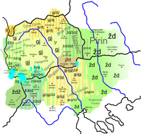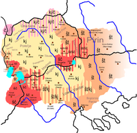 Based on a large group of features, Macedonian dialects can be divided into Eastern, Western and Northern groups. The boundary between them geographically runs approximately from Skopje and Skopska Crna Gora along the rivers Vardar and Crna.[5] There are numerous isoglosses between these dialectal variations, with structural differences in phonetics, prosody (accentuation), morphology and syntax.[5] The Western group of dialects can be subdivided into smaller dialectal territories, the largest group of which includes the central dialects.[37] The linguistic territory where Macedonian dialects were spoken also span outside the country and within the region of Macedonia, including Pirin Macedonia into Bulgaria and Aegean Macedonia into Greece.[38]
