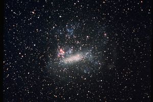 ALMA antennae bathed in red light. In the background are the southern Milky Way on the left and the Magellanic Clouds at the top.[1]