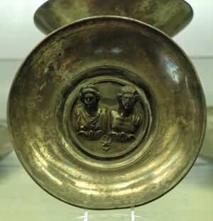 - ^ Although the identification of Mercury is secure, based on the presence of the caduceus, the one-shouldered garment called the chlamys, and his winged head, the female figure has been identified variously. The cup is part of the Berthouville Treasure, found within a Gallo-Roman temple precinct; see Lise Vogel, The Column of Antoninus Pius, Loeb Classical Library Monograph (Harvard University Press, 1973), p. 79 f., and Martin Henig, Religion in Roman Britain, Taylor & Francis, 1984, 2005, p. 119 f. In Gaul, Mercury's regular consort is one of the Celtic goddesses, usually Rosmerta. The etymology of Rosmerta's name as "Great Provider" suggests a theology compatible with that of Maia "the Great". The consort on the cup has also been identified as Venus by M. Chabouillet, Catalogue général et raisonné des camées et pierres gravées de la Bibliothéque Impériale, Paris 1858, p. 449. Maia is suggested by the concomitant discovery of a silver bust, not always considered part of the hoard proper but more securely identified as Maia and connected to Rosmerta; see E. Babelon, Revue archéologique 24 (1914), pp. 182–190, as summarized in American Journal of Archaeology 19 (1915), p. 485.