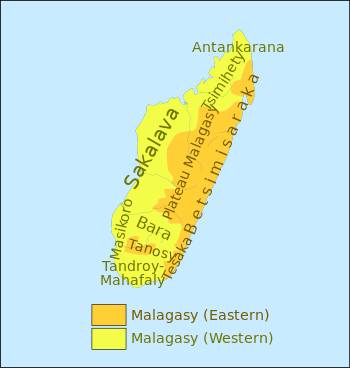 There are two principal dialects of Malagasy; Eastern (including Merina) and Western (including Sakalava), with the isogloss running down the spine of the island, the south being western, and the central plateau and much of the north (apart from the very tip) being eastern. Ethnologue encodes 12 variants of Malagasy as distinct languages. They have about a 70% similarity in lexicon with the Merina dialect.