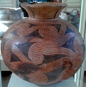 Travelers in the 1800s noted both the presence of mounds and the beauty of the ceramics found inside them or exposed on their sides.[9] Museums in Europe and the United States began to collect some of the larger and more beautiful pieces, the largest of which are funerary urns. Buried in house floors constructed on the tops of the mounds, the elaborately decorated urns contain the remains of significant individuals. When the individuals died, the flesh was cleared from their bones and the remains were placed in the urns, which were topped with a bowl or platter.[10]