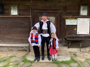 Romanians wearing Maramureș traditional clothing at a church in Sat-Șugatag