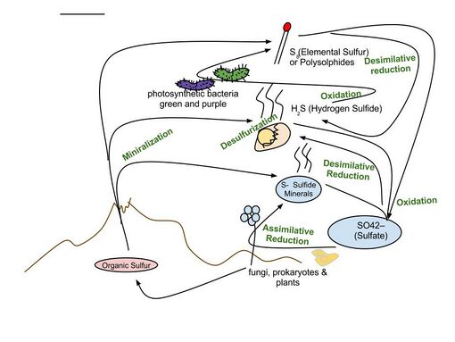 98. ^ Klotz MG, Bryant DA, Hanson TE (2011). "The microbial sulfur cycle". Frontiers in Microbiology (in الإنجليزية). 2: 241. doi:10.3389/fmicb.2011.00241. PMC 3228992. PMID 22144979.