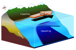 Two mechanisms which result in upwelling. In each case, if the wind direction were reversed it would induce downwelling.[21]