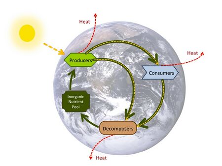 Energy flows directionally through ecosystems, entering as sunlight (or inorganic molecules for chemoautotrophs) and leaving as heat during the many transfers between trophic levels. However, the matter that makes up living organisms is conserved and recycled. The six most common elements associated with organic molecules—carbon, nitrogen, hydrogen, oxygen, phosphorus, and sulfur—take a variety of chemical forms and may exist for long periods in the atmosphere, on land, in water, or beneath the Earth's surface. Geologic processes, such as weathering, erosion, water drainage, and the subduction of the continental plates, all play a role in this recycling of materials. Because geology and chemistry have major roles in the study of this process, the recycling of inorganic matter between living organisms and their environment is called a biogeochemical cycle.[1]