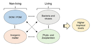 Connections between the different compartments of the living (bacteria/viruses and phyto−/zooplankton) and the nonliving (DOM/POM and inorganic matter) environment[78]