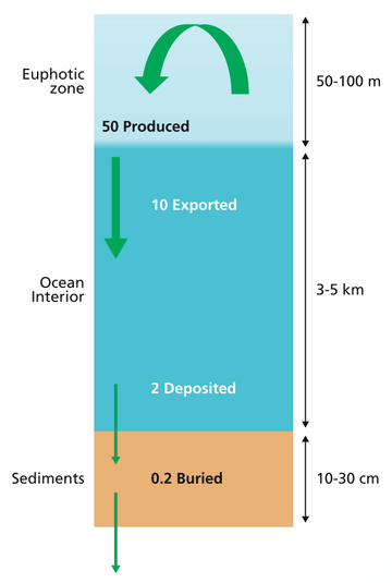 The diagram above shows a simplified budget of ocean carbon flows. It is composed of three simple interconnected box models, one for the euphotic zone, one for the ocean interior or dark ocean, and one for ocean sediments. In the euphotic zone, net phytoplankton production is about 50 Pg C each year. About 10 Pg is exported to the ocean interior while the other 40 Pg is respired. Organic carbon degradation occurs as particles (marine snow) settle through the ocean interior. Only 2 Pg eventually arrives at the seafloor, while the other 8 Pg is respired in the dark ocean. In sediments, the time scale available for degradation increases by orders of magnitude with the result that 90% of the organic carbon delivered is degraded and only 0.2 Pg C yr−1 is eventually buried and transferred from the biosphere to the geosphere.[66]
