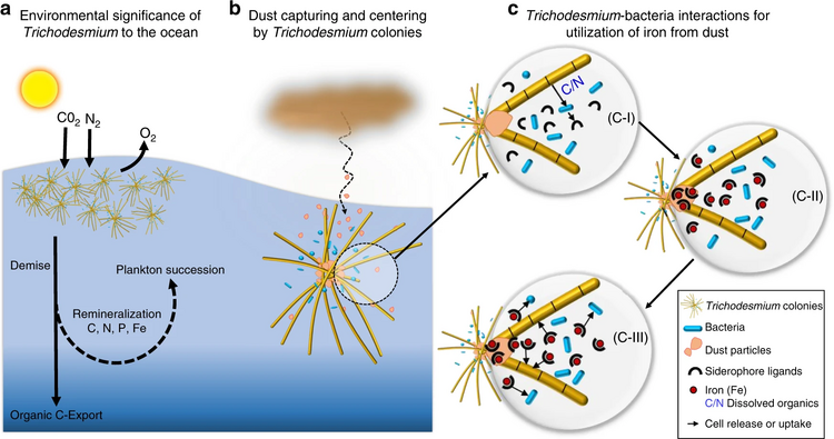 110. ^ Basu, Subhajit; Gledhill, Martha; De Beer, Dirk; Prabhu Matondkar, S. G.; Shaked, Yeala (2019). "Colonies of marine cyanobacteria Trichodesmium interact with associated bacteria to acquire iron from dust". Communications Biology. 2: 284. doi:10.1038/s42003-019-0534-z. PMC 6677733. PMID 31396564. CC-BY icon.svg Modified text was copied from this source, which is available under a Creative Commons Attribution 4.0 International License.