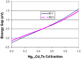 where k is Boltzmann's constant, q is the elementary electric charge, t is the material temperature, x is the percentage of cadmium concentration, and Eg is the bandgap given by [2]