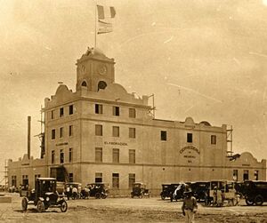 In the mid-19th century, a geologist working for the Southern Pacific Railroad came to the delta area, discovering what the native Yumans had known for centuries: that the thick river sediment deposits made the area prime farming land. These sediments extended far to the west of the river itself, accumulating in a shallow basin below the Sierra de Cucapá.[3] However, from this time period until the 1880s, the area was almost completely unpopulated, mostly due to its harsh climate. In 1888, the federal government granted a large part of northern Baja California state, including Mexicali, to Guillermo Andrade, with the purpose of colonizing the area on the recently created border with the United States. However, around 1900, the only area with any real population, aside from the Cocopah, were concentrated in Los Algodones, to the east of Mexicali.[5]