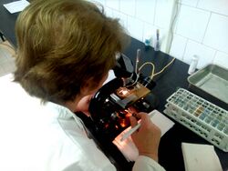 Optical or light microscopy involves passing visible light transmitted through or reflected from the sample through a single lens or multiple lenses to allow a magnified view of the sample.[11] The resulting image can be detected directly by the eye, imaged on a photographic plate, or captured digitally. The single lens with its attachments, or the system of lenses and imaging equipment, along with the appropriate lighting equipment, sample stage, and support, makes up the basic light microscope. The most recent development is the digital microscope, which uses a CCD camera to focus on the exhibit of interest. The image is shown on a computer screen, so eye-pieces are unnecessary.[12]