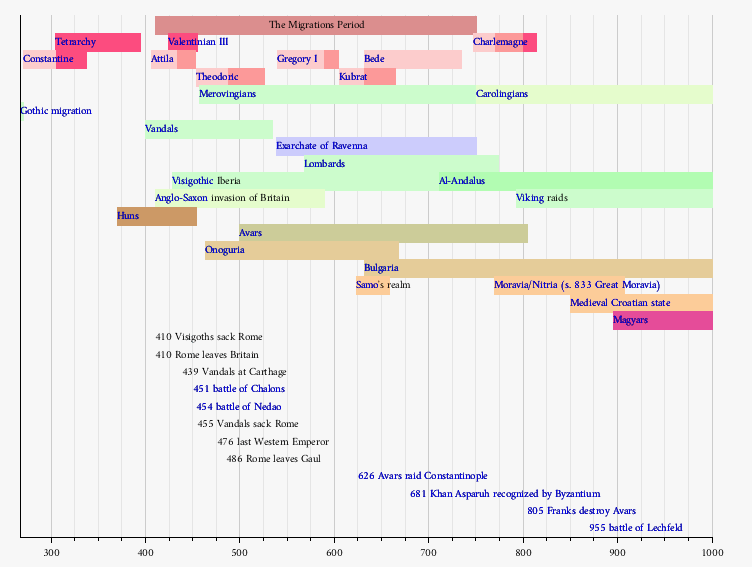 - ^ The delimiting dates vary but often cited are 410, the Sack of Rome by Alaric I; and 751, the accession of Pippin the Short and the establishment of the Carolingian dynasty.