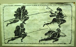 References to "great shields" occur in their usage on the front line to protect spearmen and crossbowmen. Shields were also commonly paired with the single edged dao and used among cavalrymen.[28] Descriptions of the Battle of Guandu mention that Cao Cao's soldiers employed shield cover above their heads each time they moved out into the open due to oppressive arrow fire from Yuan Shao's wooden towers.[29]