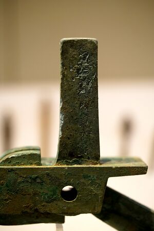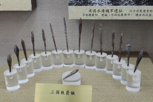 Weapons were largely the same as well, although there was more focus on idiosyncratic weapons wielded by particularly noteworthy individuals. For example, one man named Chen An apparently wielded a great sword over two meters in length[21] and Sun Quan's wife had over a hundred female attendants armed with daos.[22] Trends in warfare that had already been underway during the Eastern Han continued to gain momentum. By the end of the Three Kingdoms, the single edged dao, with its thicker and more durable dull side, had overtaken the straight double-edged jian as the primary close combat weapon.[23] The more expensive, lighter, and less durable jian entered the domain of court dancers, officials, and expert warriors.[24] While halberds were still used during the period, long spears and lances (similar to pikes) re-rose in prominence over halberds for infantry and cavalry forces. This was believed to have been the result of the long spear and lances' simpler construction, the adoption of long spears and lances by heavy cavalry to strike infantrymen, and the adoption of tighter infantry formations with less room for swinging and hooking [of halberds] in response to the greater threat by cavalry. [23][25] Soldiers in the northeast specialized in long spears.[26] After the Han dynasty, the crossbow gradually faded in importance until it made a mild resurgence during the Tang dynasty, under which the ideal expeditionary army of 20,000 included 2,200 archers and 2,000 crossbowmen.[27]