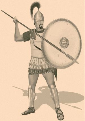 With their elite status, members of the Sacred Band received the best equipment in the Carthaginian army. Their weapons and training were similar to those of the Greek hoplites: heavy spear, sword, aspis shield, and bronze greaves, helmet, and breastplate. The hoplites also fought in a phalanx formation. The unit numbered around 2,500 soldiers according to Diodorus.[18]